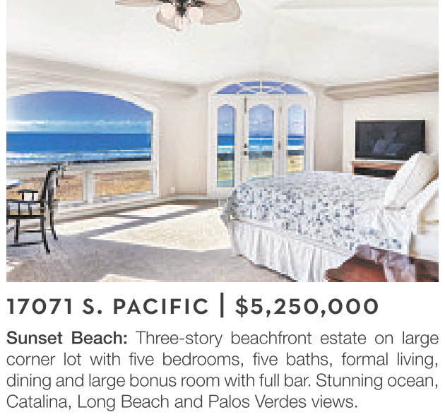 Sunset Beach: Three-story beachfront estate on large corner lot with five bedrooms, five baths, formal living, dining and large bonus room with full bar. Stunning ocean, Catalina, Long Beach and Palos Verdes views.