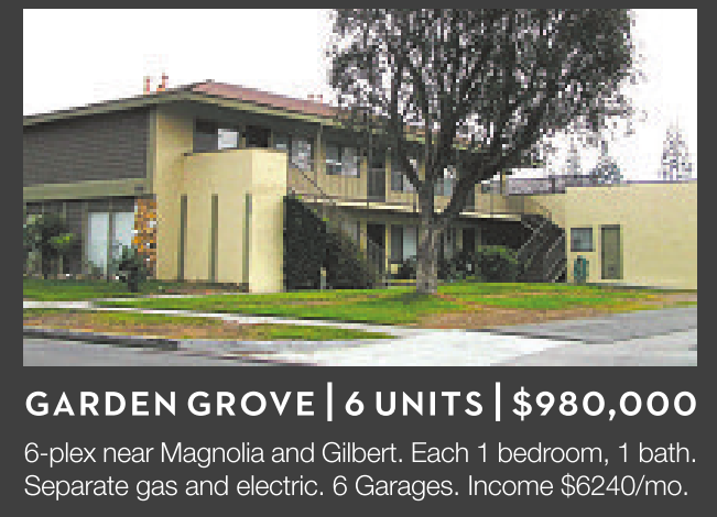 6-plex near Magnolia and Gilbert. Each 1 bedroom, 1 bath. Separate gas and electric. 6 Garages. Income $6240/mo.