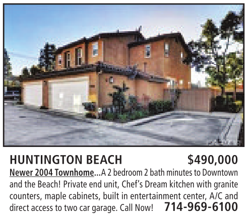 andthe Beach! Privateend unit,Chef’s Dream kitchen with granite counters, maple cabinets, built inentertainment center, A/Cand direct access to twocar garage. Call Now! 714-969-6100