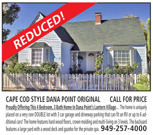 CAPE COD STYLE DANA POINT ORIGINAL CALL FOR PRICE ProudlyOffering This 4Bedroom,3BathHome In Dana Point’s LanternVillage… Thehome is uniquely placed onavery rare DOUBLE lot with 3car garage and driveway parking that can fitanRVorupto6additional cars!The home featureshardwood floors, crown molding andmulti-living on 3levels. Thebackyard featuresalarge yard with awood deck andgazebo for theprivatespa. 949-257-4000