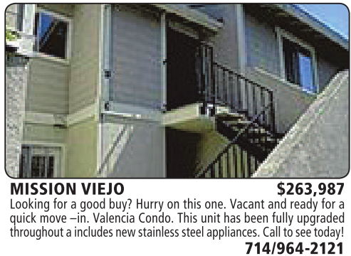 MISSION VIEJO $263,987 Looking for agood buy? Hurry onthis one. Vacant and ready for a quick move –in. Valencia Condo. This unit has been fully upgraded throughout aincludes new stainlesssteel appliances. Call to seetoday!
