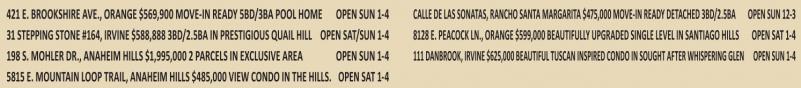 421E.BROOKSHIRE AVE.,ORANGE $569,900 MOVE-INREADY 5BD/3BA POOLHOME OPEN SUN 1-4 31 STEPPING STONE #164,IRVINE $588,888 3BD/2.5BAINPRESTIGIOUS QUAIL HILL OPENSAT/SUN 1-4 198S.MOHLERDR.,ANAHEIMHILLS $1,995,000 2PARCELS IN EXCLUSIVE AREA OPENSUN 1-4 5815 E. MOUNTAIN LOOP TRAIL,ANAHEIMHILLS $485,000 VIEWCONDO IN THEHILLS. OPENSAT 1-4 CALLE DE LASSONATAS, RANCHO SANTAMARGARITA$475,000 MOVE-INREADY DETACHED 3BD/2.5BA OPENSUN 12-3 8128 E. PEACOCKLN.,ORANGE $599,000 BEAUTIFULLYUPGRADEDSINGLELEVEL IN SANTIAGO HILLS OPENSAT 1-4 111 DANBROOK,IRVINE $625,000 BEAUTIFULTUSCANINSPIRED CONDOINSOUGHT AFTERWHISPERING GLEN OPEN SUN 1-4