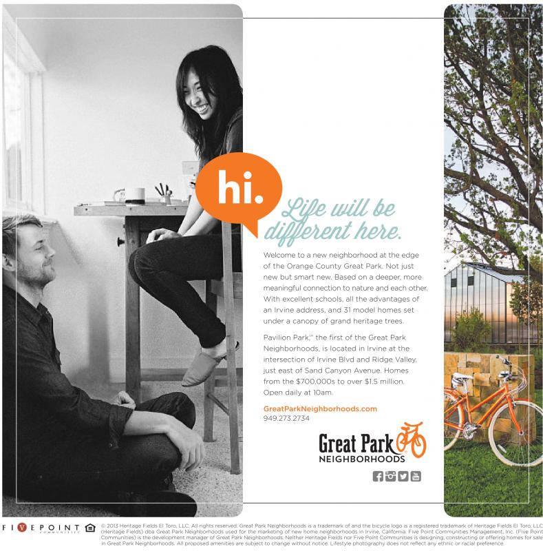 ©2013 Heritage Fields El Toro, LLC. All rights reserved. Great Park Neighborhoods is atrademark of and the bicycle logo is aregistered trademark of Heritage Fields El Toro, LLC (Heritage Fields) dba Great Park Neighborhoods used for the marketing of new home neighborhoods in Irvine, California. Five Point Communities Management, Inc. (Five Point Communities) isthe development manager of Great Park Neighborhoods. Neither Heritage Fields nor Five Point Communities is designing, constructing or offering homes for sale in Great Park Neighborhoods. All proposed amenities are subject to change without notice. Lifestyle photography does not reflect any ethnic or racial preference.