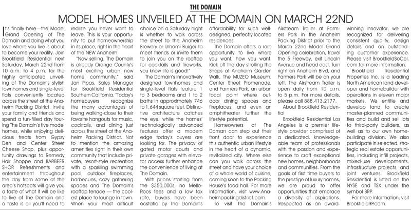 finally here—the Model Grand Opening of The Domain and doing what you love where you live is about to become your reality. Join Brookfield Residential next Saturday, March 22nd from 10 a.m. to 4 p.m. for the highly anticipated unveiling of The Domain’s stylish townhomes and single-level flats conveniently located across the street at the Anaheim Packing District. Invite your family and friends and spend a fun-filled day touring The Domain’s five model homes, while enjoying delicious treats from Gypsy Den and Center Street Cheese Shop, plus opportunity drawings to Remedy Hair Shoppe and BARBEER SHOP. Refreshments and entertainment throughout the day from some of the area’s hotspots will give you a taste of what it will be like to live at The Domain and a taste is all you’ll need to