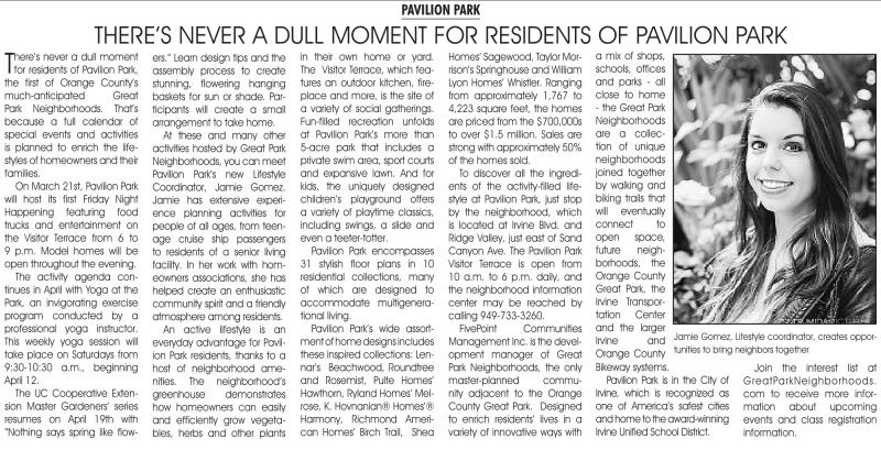 never a dull moment for residents of Pavilion Park, the first of orange County’s much-anticipated Great Park Neighborhoods. That’s because a full calendar of special events and activities is planned to enrich the lifestyles of homeowners and their families.