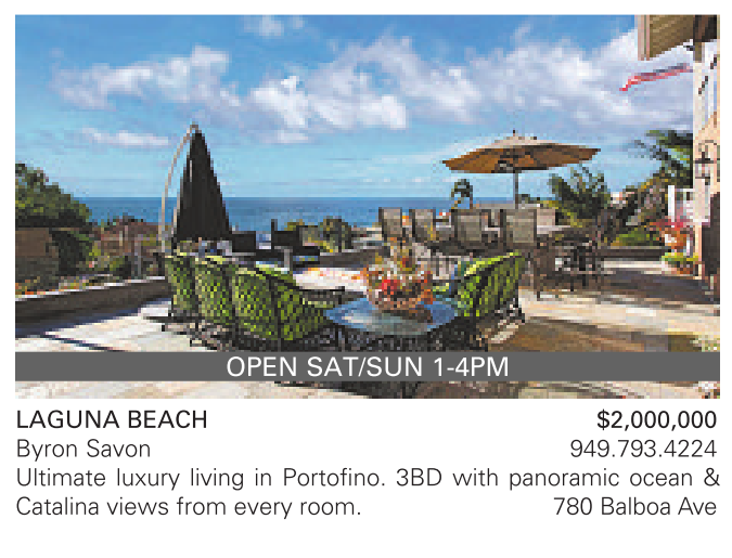 LAGUNA BEACH $2,000,000 Byron Savon 949.793.4224 Ultimate luxury living in Portofino. 3BD with panoramic ocean & Catalina views from every room. 780 Balboa Ave