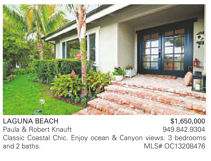 LAGUNA BEACH $1,650,000 Paula & Robert Knauft 949.842.9304 Classic Coastal Chic. Enjoy ocean & Canyon views. 3 bedrooms and 2 baths. MLS# OC13208476