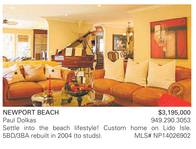 NEWPORT BEACH $3,195,000 Paul Dolkas 949.290.3053 Settle into the beach lifestyle! Custom home on Lido Isle. 5BD/3BA rebuilt in 2004 (to studs). MLS# NP14026902