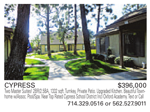 CYPRESS $396,000 TwoMaster Suites! 2BR/2.5BA, 1332 sqft. Turnkey, Private Patio. Upgraded Kitchen. Beautiful Townhome w/Assoc. Pool/Spa. Near TopRated Cypress School District Incl Oxford Academy. Text or Call 714.329.0516 or562.527.9011