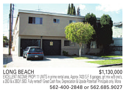 LONG BEACH $1,130,000 EXCELLENT INCOME PROP! 11 UNITS inprime rental area, Approx 7420 S.F. 6garages, grt mix w/9 one’s, a2BD &a3BD/1.5BD. Fully rented!! Great Cash flow, Depreciation &Upside Potential! Principals only. Mona 562-400-2848 or 562.685.9027