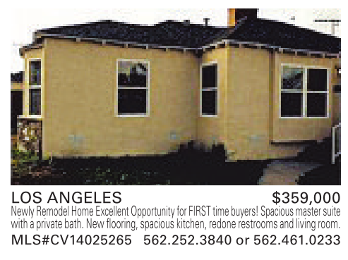 LOS ANGELES $359,000 Newly RemodelHome ExcellentOpportunity forFIRST time buyers!Spacious master suite with aprivate bath. Newflooring,spaciouskitchen,redone restrooms andliving room. MLS#CV14025265 562.252.3840 or 562.461.0233