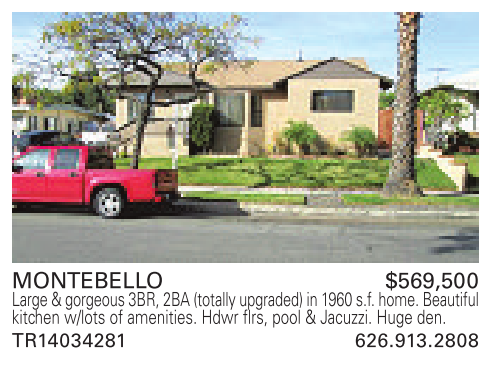 MONTEBELLO $569,500 Large &gorgeous 3BR, 2BA(totally upgraded) in 1960 s.f.home. Beautiful kitchen w/lots of amenities. Hdwr flrs, pool &Jacuzzi. Huge den. TR14034281 626.913.2808