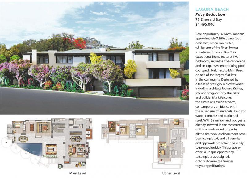 Main Level LAGUNA BEACH Price Reduction 77 Emerald Bay $4,495,000 Rare opportunity.Awarm, modern, approximately 7,690 square foot oasis that, when completed, will be one of the finest homes in exclusive Emerald Bay.This exceptional home features five bedrooms, six baths, five-car garage and an expansive entertaining pool courtyard. Built next to Main Beach on one of the largest flat lots in the community.Designed by ateam of prestigious professionals, including architect Richard Krantz, interior designer Terry Hunziker and builder Mark Falcone, the estate will exude awarm, contemporary ambiance with the mixed use of materials like rustic wood, concrete and blackened steel. With $2 million and two years already invested in the construction of this one-of-a-kind property, all the site work and basement have been completed, and all permits and approvals are active and ready to proceed quickly.This property offers aunique opportunity to complete as designed, or to customize the finishes to your specifications. Upper Level