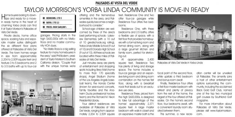 buyers looking to downsize and ready for a movein ready home in the heart of charming Yorba Linda can find it at Taylor Morrison’s Palisades at Vista Del Verde.