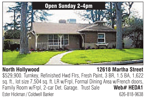 North Hollywood Open Sunday 2-4pm 12618 Martha Street $529,900. Turnkey,Refinished Hwd Flrs, Fresh Paint, 3BR, 1.5 BA, 1,622 sq. ft., lot size 7,504 sq. ft. LR w/Frpl, Formal Dining Area w/French doors, Family Room w/Frpl, 2-car Det. Garage. Trust Sale Web# HEDA1 Ester Hickman /Coldwell Banker 626-818-9638