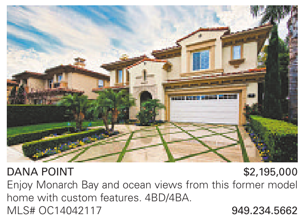 DANA POINT $2,195,000 Enjoy Monarch Bay and ocean views from this former model home with custom features. 4BD/4BA. MLS# OC14042117 949.234.5662
