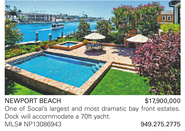 NEWPORT BEACH $17,900,000 One of Socal’s largest and most dramatic bay front estates. Dock will accommodate a 70ft yacht. MLS# NP13086943 949.275.2775