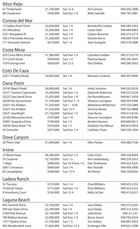 32 Black Hawk $6,280,000 Sat/Sun 1-5 ClaraChen 949.228.6064 53 Cezanne $2,750,000 Sun 1-5 KimSeidenberg 949.378.5353 7Alejo $898,000 Sat10-4/Sun 1-5 DeeShiohama 949.322.4225 5061 Cinnamon $689,000 Sun 1-4 Ken Hanzlik 949.499.5900 82 Lamplighter $589,000 Sun 12-4 ArtRivera 949.230.8303