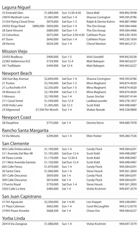 33 Emerald Glen $1,689,000 Sun 12:30-4:30 Dana Wall 949.892.9598 23876 Medinah Lane $1,065,000 Sat/Sun 1-4 Shauna Covington 949.395.8786 31354 Flying Cloud Drive $879,000 Sat/Sun 1-5 Ralph &Denise Kuhns 949.887.9980 24592 Kings Road $800,000 -$850,000 Sat/Sun 1-4 TheOra Group 949.584.4466 28 SaintVincent $689,000 Sat/Sun 1-4 TheOra Group 949.584.4466 23 Columbus $675,000 Sat/Sun 2:30-4:30 Cathleen Pryor 949.230.1834 67 Dunn $640,000 Sat/Sun 1-4 Cathleen Pryor 949.230.1834 28 Vienna $624,500 Sun 1-4 Cheryl Newton 949.463.2121