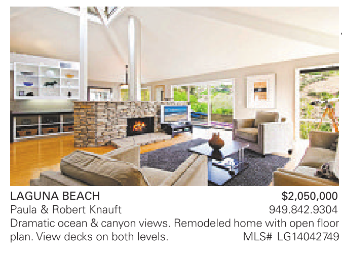 LAGUNA BEACH $2,050,000 Paula & Robert Knauft 949.842.9304 Dramatic ocean &canyonviews. Remodeled home with open floor plan. View decks on both levels. MLS# LG14042749