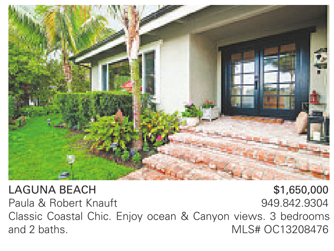 LAGUNA BEACH $1,650,000 Paula & Robert Knauft 949.842.9304 Classic Coastal Chic. Enjoy ocean & Canyon views. 3 bedrooms and 2 baths. MLS# OC13208476