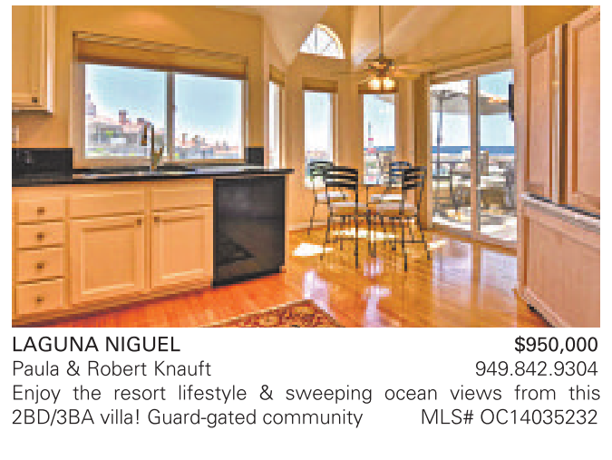 LAGUNA NIGUEL $950,000 Paula & Robert Knauft 949.842.9304 Enjoy the resort lifestyle & sweeping ocean views from this 2BD/3BA villa! Guard-gated community MLS# OC14035232