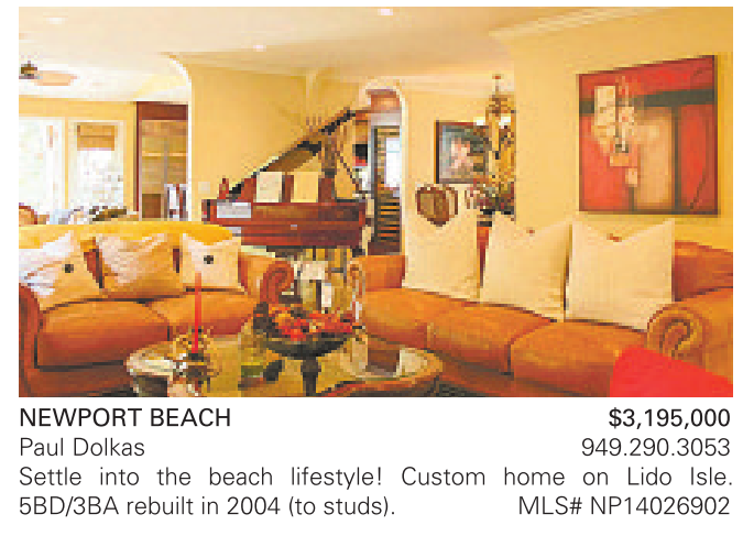NEWPORT BEACH $3,195,000 Paul Dolkas 949.290.3053 Settle into the beach lifestyle! Custom home on Lido Isle. 5BD/3BA rebuilt in 2004 (to studs). MLS# NP14026902