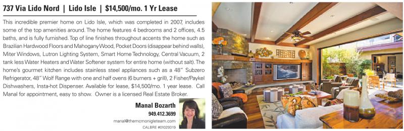 This incredible premier home on Lido Isle, which was completed in 2007, includes some of the top amenities around. The home features 4 bedrooms and 2 offices, 4.5 baths, and is fully furnished. Top of line finishes throughout accents the home such as Brazilian Hardwood Floors and MahoganyWood, Pocket Doors (disappear behind walls), Miter Windows, Lutron Lighting System, Smart Home Technology, Central Vacuum, 2 tank less Water Heaters and Water Softener system forentire home (without salt).The home’s gourmet kitchen includes stainless steel appliances such as a 48” Subzero Refrigerator,48” Wolf Range with one and half ovens (6 burners +grill), 2Fisher/Paykel Dishwashers, Insta-hot Dispenser. Available for lease, $14,500/mo. 1 year lease. Call Manal for appointment, easy to show. Owner is a licensed Real Estate Broker.