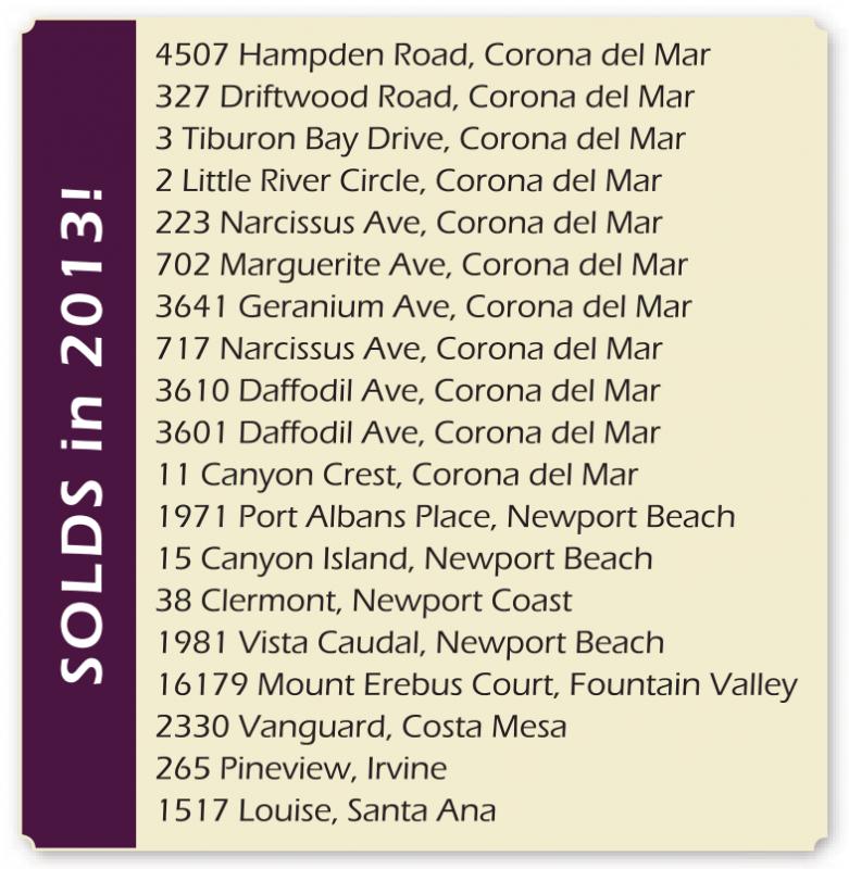4507 Hampden Road, Corona del Mar 327 Driftwood Road, Corona del Mar 3 Tiburon Bay Drive, Corona del Mar 2 Little River Circle, Corona del Mar 223 Narcissus Ave, Corona del Mar 702 Marguerite Ave, Corona del Mar 3641 Geranium Ave, Corona del Mar 717 Narcissus Ave, Corona del Mar 3610 Daffodil Ave, Corona del Mar 3601 Daffodil Ave, Corona del Mar 11 Canyon Crest, Corona del Mar 1971 Port Albans Place, Newport Beach 15 Canyon Island, Newport Beach 38 Clermont, Newport Coast 1981 Vista Caudal, Newport Beach 16179 Mount Erebus Court, Fountain Valley 2330 Vanguard, Costa Mesa 265 Pineview, Irvine 1517 Louise, Santa Ana