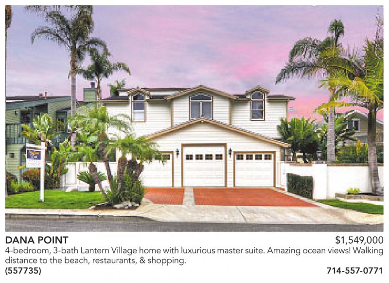 DANA POINT $1,549,000 4-bedroom,3-bathLantern Villagehomewithluxurious master suite. Amazingocean views! Walking distance to thebeach,restaurants,&shopping. (557735) 714-557-0771