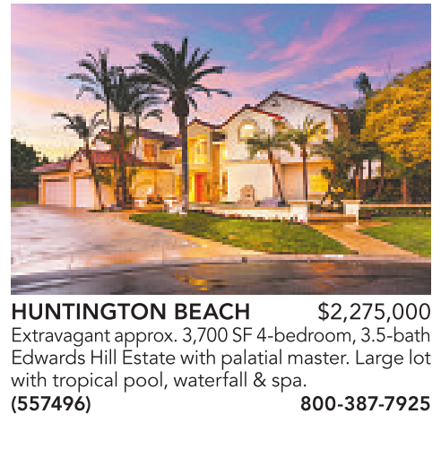 HUNTINGTON BEACH $2,275,000 Extravagantapprox. 3,700SF4-bedroom,3.5-bath EdwardsHill Estate with palatial master.Largelot with tropical pool,waterfall &spa. (557496) 800-387-7925