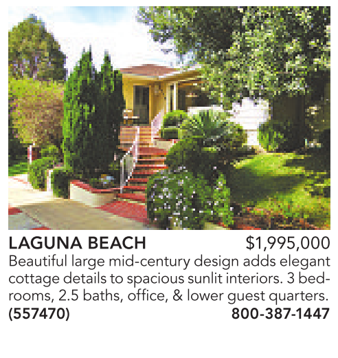 LAGUNA BEACH $1,995,000 Beautiful largemid-century design adds elegant cottagedetails to spacious sunlit interiors. 3bedrooms, 2.5baths,office,&lowerguest quarters.