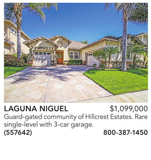 LAGUNA NIGUEL $1,099,000 Guard-gatedcommunity of HillcrestEstates.Rare single-levelwith3-car garage. (557642) 800-387-1450