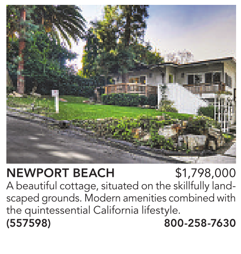 NEWPORT BEACH $1,798,000 Abeautiful cottage, situated on theskillfullylandscaped grounds. Modern amenities combinedwith thequintessential California lifestyle. (557598) 800-258-7630