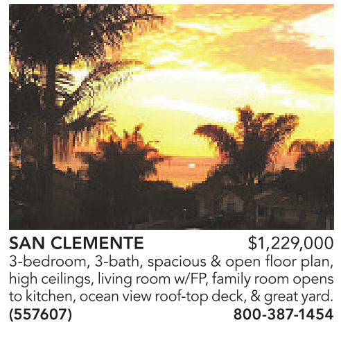 SAN CLEMENTE $1,229,000 3-bedroom, 3-bath, spacious & open floor plan, high ceilings, living room w/FP,familyroom opens to kitchen, oceanview roof-top deck,&great yard. (557607) 800-387-1454