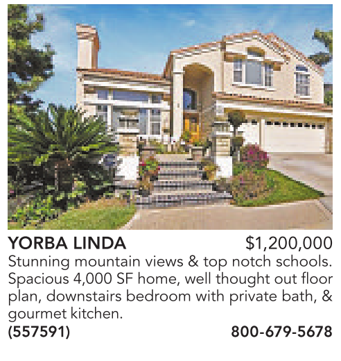 YORBA LINDA $1,200,000 Stunning mountain views & top notch schools. Spacious 4,000 SF home, well thought out floor plan, downstairs bedroom with private bath, & gourmet kitchen. (557591) 800-679-5678