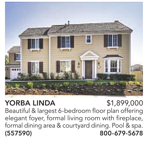 YORBA LINDA $1,899,000 Beautiful &largest6-bedroom floor plan offering elegant foyer, formal living room with fireplace, formal diningarea&courtyard dining. Pool &spa. (557590) 800-679-5678