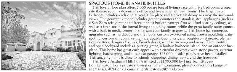 This lovely Anaheim Hills home is listed at $1,795,000 by First Team® agent Lori Langston. For a private showing or more information, please contact Lori Langston at (714) 403-0214 or via email at lorilangston.re@gmail.com.