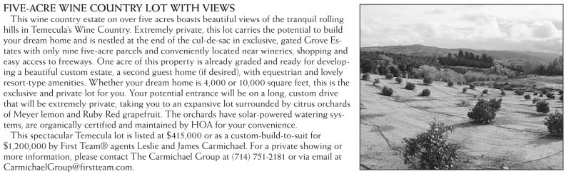 This spectacular Temecula lot is listed at $415,000 or as a custom-build-to-suit for $1,200,000 by First Team® agents Leslie and James Carmichael. For a private showing or more information, please contact The Carmichael Group at (714) 751-2181 or via email at CarmichaelGroup@firstteam.com.
