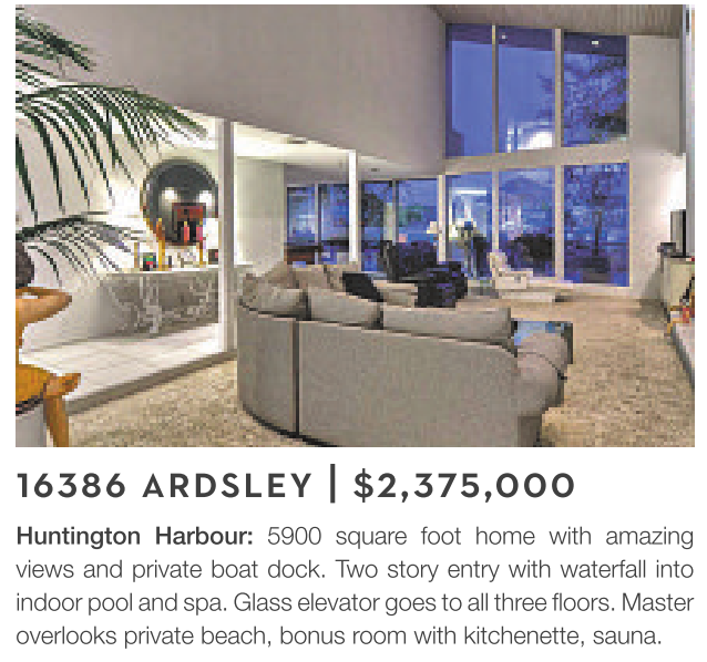 16386 ARDSLEY | $2,375,000 Huntington Harbour: 5900 square foot home with amazing views and private boat dock. Two story entry with waterfall into indoor pool and spa. Glass elevatorgoes to all three floors. Master overlooks private beach, bonus room with kitchenette, sauna.