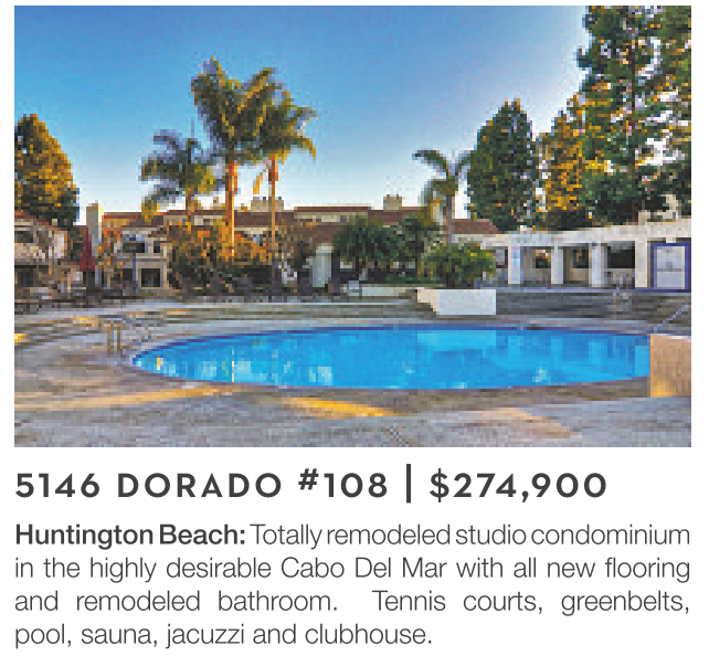 Huntington Beach: Totally remodeled studio condominium in the highly desirable Cabo Del Mar with all new flooring and remodeled bathroom. Tennis courts, greenbelts, pool, sauna, jacuzzi and clubhouse.