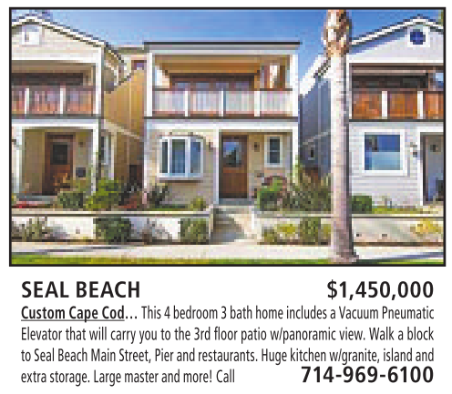 SEAL BEACH $1,450,000 Custom Cape Cod… This 4bedroom3bathhome includes aVacuum Pneumatic Elevator that will carry you to the 3rd floor patio w/panoramic view. Walk ablock to Seal Beach Main Street,Pierand restaurants. Hugekitchen w/granite,island and extrastorage.Large master and more!Call 714-969-6100