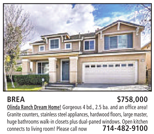 BREA $758,000 Olinda Ranch Dream Home! Gorgeous 4bd.,2.5 ba. andanoffice area! Granite counters,stainless steelappliances, hardwood floors,large master, huge bathroomswalk-inclosets plus dual-panedwindows. Open kitchen connects to living room!Please call now 714-482-9100