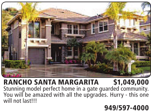 RANCHO SANTA MARGARITA $1,049,000 Stunning model perfect home inagate guarded community. You will be amazed with all the upgrades. Hurry -this one will notlast!!!