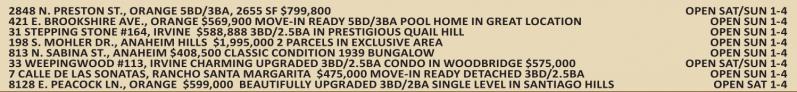 2848 N. PRESTONST.,ORANGE 5BD/3BA,2655SF$799,800 OPENSAT/SUN 1-4 421E.BROOKSHIRE AVE.,ORANGE $569,900 MOVE-INREADY 5BD/3BA POOLHOME IN GREAT LOCATION OPEN SUN1-4 31 STEPPING STONE#164, IRVINE $588,888 3BD/2.5BAINPRESTIGIOUS QUAIL HILL OPENSUN 1-4 198S.MOHLERDR.,ANAHEIMHILLS $1,995,000 2PARCELS IN EXCLUSIVE AREA OPENSUN 1-4 813N.SABINA ST., ANAHEIM $408,500 CLASSICCONDITION 1939 BUNGALOW OPEN SUN1-4 33 WEEPINGWOOD #113,IRVINE CHARMING UPGRADED3BD/2.5BA CONDOINWOODBRIDGE$575,000 OPEN SAT/SUN1-4 7CALLE DE LASSONATAS, RANCHO SANTAMARGARITA $475,000 MOVE-INREADY DETACHED 3BD/2.5BA OPENSUN 1-4 8128 E. PEACOCKLN.,ORANGE $599,000 BEAUTIFULLYUPGRADED3BD/2BA SINGLELEVEL IN SANTIAGOHILLS OPEN SAT1-4