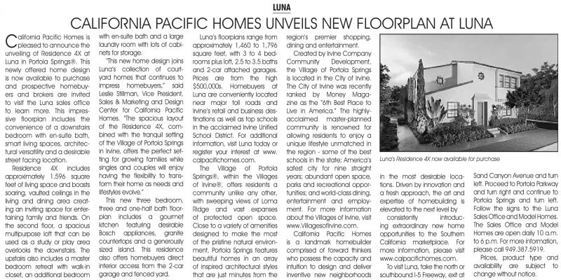 “This new home design joins Luna’s collection of courtyard homes that continues to impress homebuyers,” said Leslie Stillman, vice President, Sales & marketing and Design Center for California Pacific Homes. “The spacious layout of the Residence 4X, combined with the tranquil setting of the village of Portola Springs in irvine, offers the perfect setting for growing families while singles and couples will enjoy having the flexibility to transform their home as needs and lifestyles evolve.”