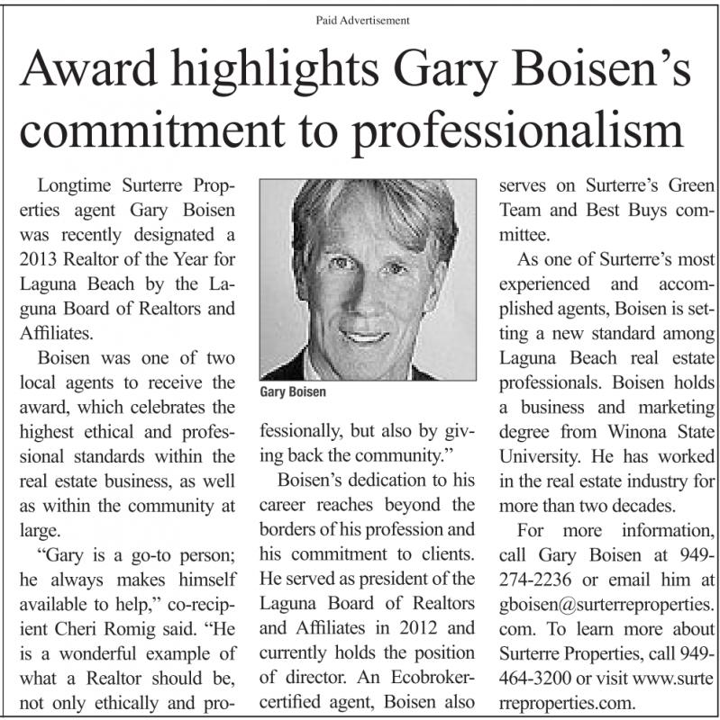 Longtime Surterre Properties agent Gary Boisen was recently designated a 2013 Realtor of the Year for Laguna Beach by the Laguna Board of Realtors and Affiliates.
