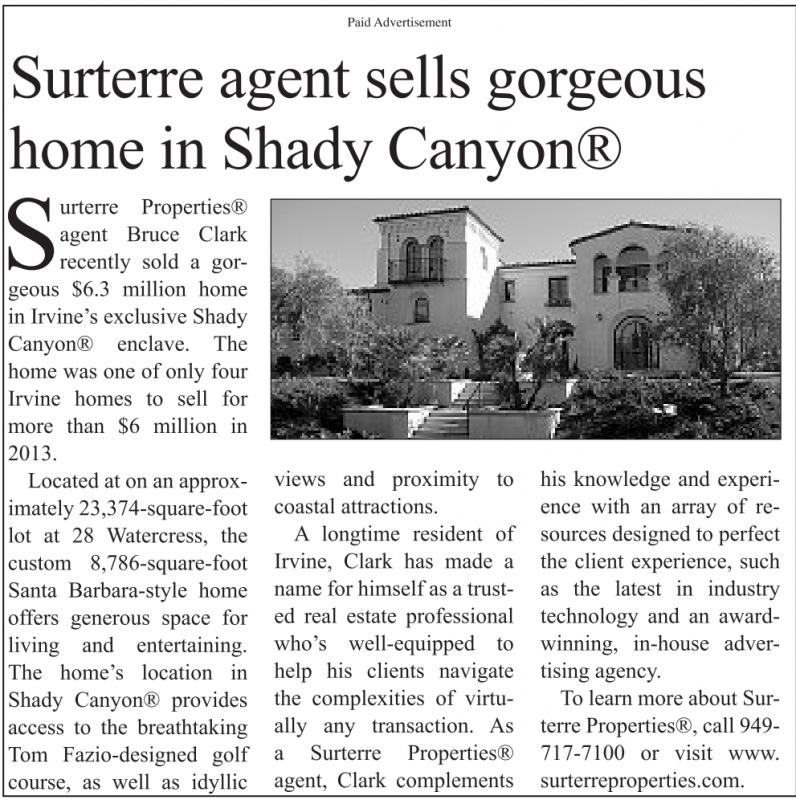 Properties® agent Bruce Clark recently sold a gorgeous $6.3 million home in Irvine’s exclusive Shady Canyon® enclave. The home was one of only four Irvine homes to sell for more than $6 million in 2013.