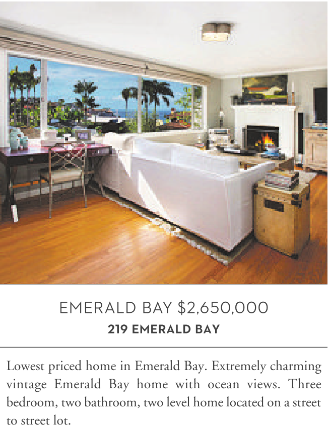 Lowest priced home in Emerald Bay. Extremely charming vintage Emerald Bay home with ocean views. Three bedroom, two bathroom, two level home located on a street to street lot.