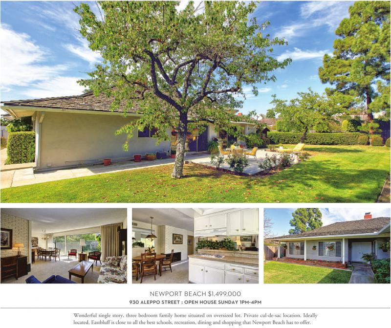 NEWPORT BEACH $1,499,000 930 aleppo street : open house sunday 1pm-4pm Wonderful single story, three bedroom family home situated on oversized lot. Private cul-de-sac location. Ideally located, Eastbluff is close to all the best schools, recreation, dining and shopping that Newport Beach has to offer.